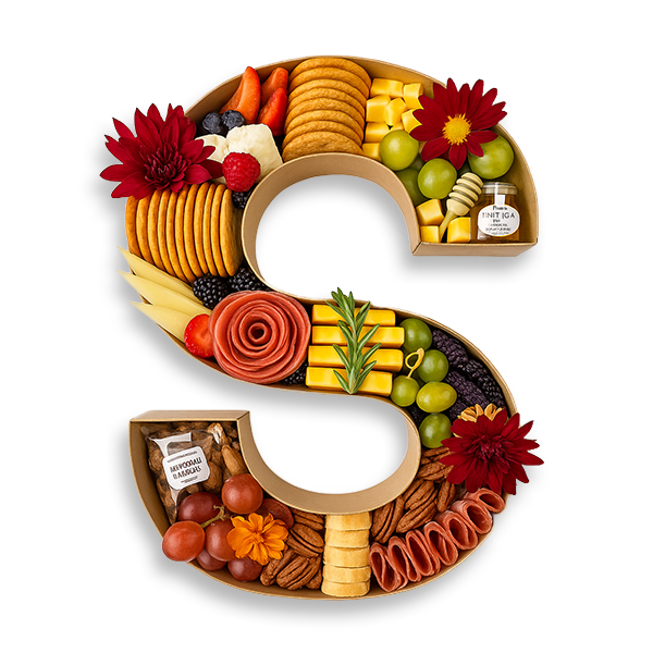 Customize your order with a number or letter charcuterie board. Items included in the letters are the same as signature fig+brie board items